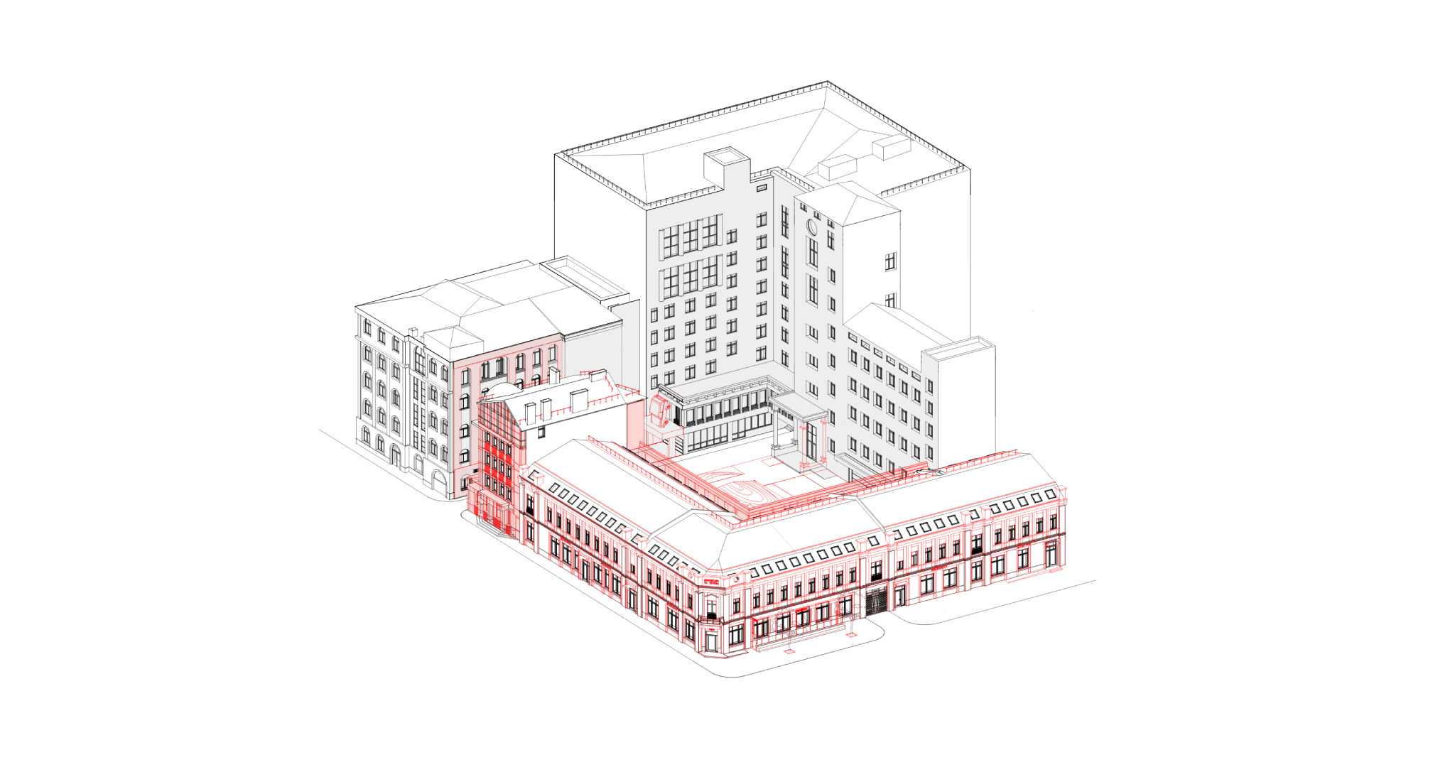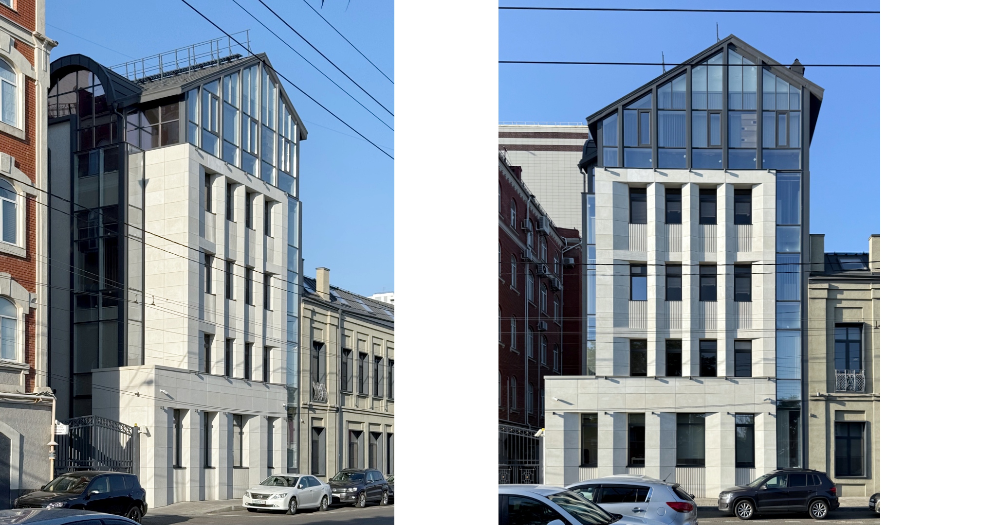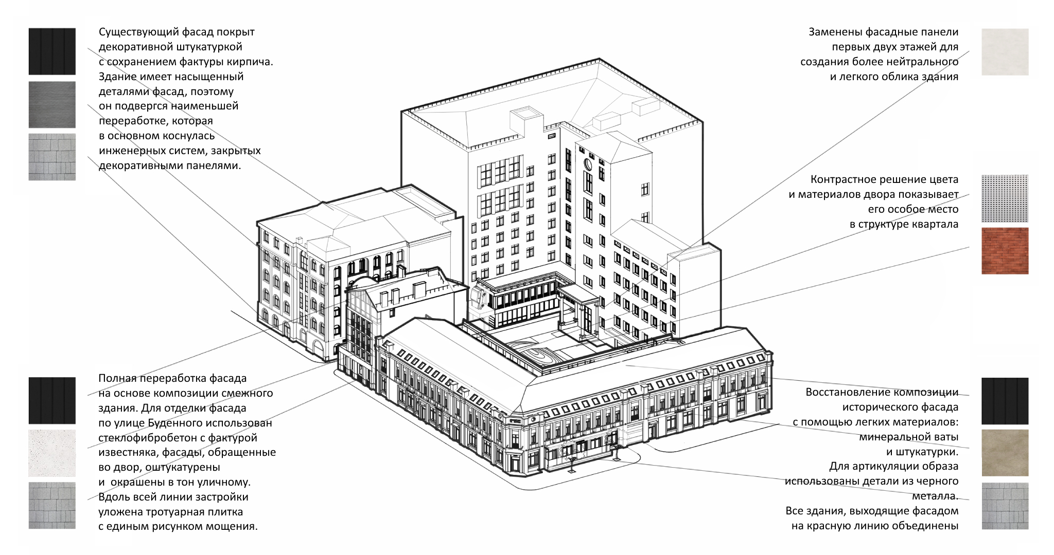 В качестве основного технического решения выбрана система штукатурного фасада с негорючей базальтовой теплоизоляцией по каменному основанию, что связано с состоянием кладки и конструкции наружных стен, которые требовали скрыть усиление и защиты от осадков. Историческую кладку можно увидеть в интерьере во всех помещениях, примыкающих к наружной стене. Кроме этого дореволюционный кирпич, вынимавшийся при разборе внутренних перегородок при выполнении усиления здания, использован для кладки восстановленных столбиков на кровле и аттика.