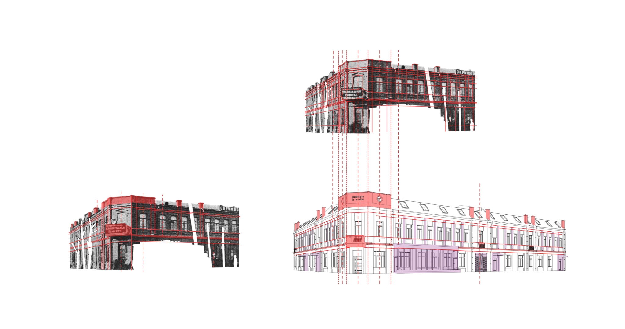 По этим причинам мы решили пойти по пути творческого переосмысления прежней архитектуры с восстановлением основных исходных элементов композиции фасада – ритма окон, аттика, пилонов, лопаток, столбиков и поясков без декоративных «резных» элементов, присущих краснодарской дореволюционной архитектуре.