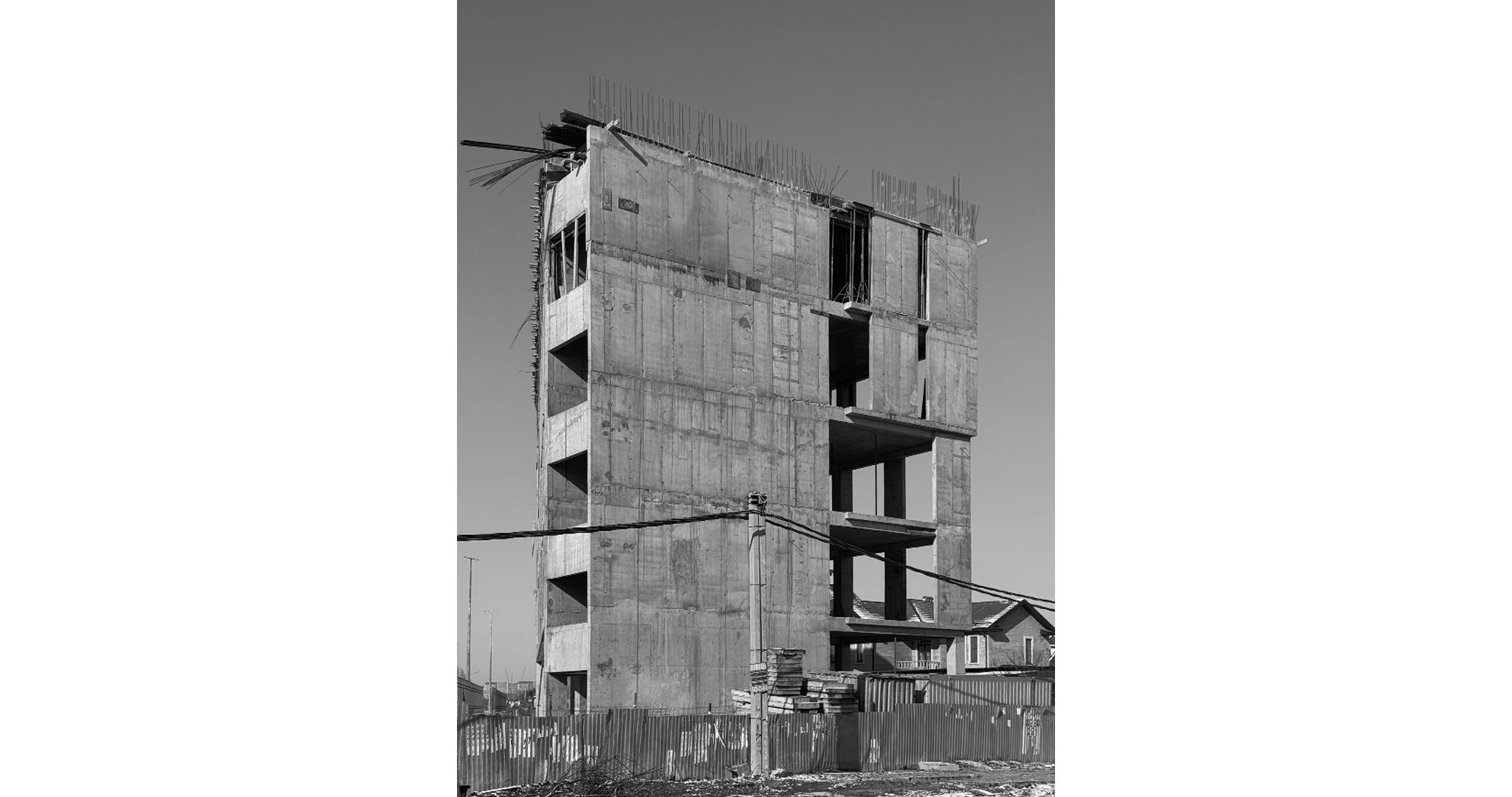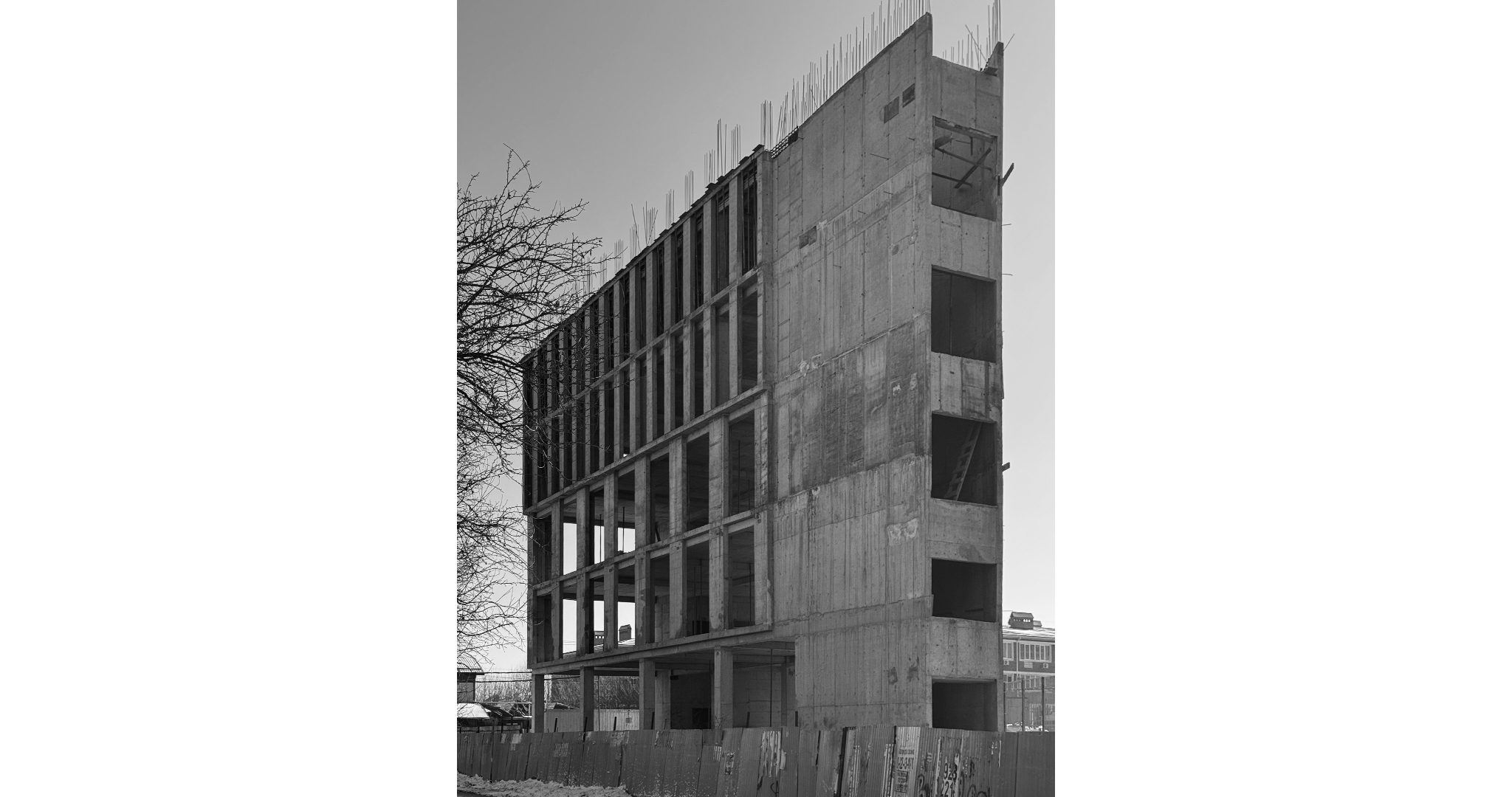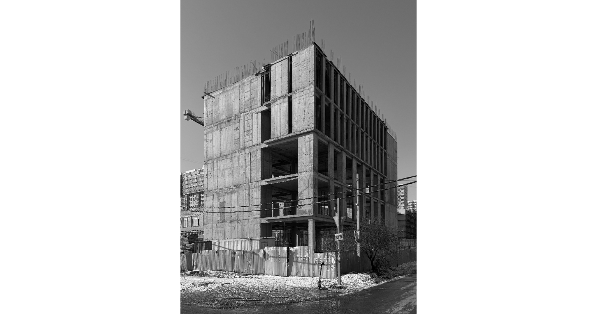 В проекте предложено решение административного здания со встроенной парковкой на первом этаже. Общая геометрия постройки отвечает сложной треугольной форме участка, а также планировочным ограничениям, наложенным инженерными коммуникациями.